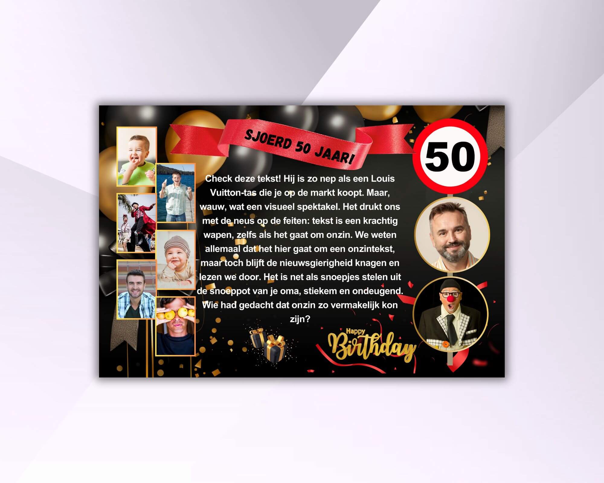 50 jaar word je maar één keer – dus maak het onvergetelijk met een persoonlijk spandoek vol herinneringen, humor en herkenning!